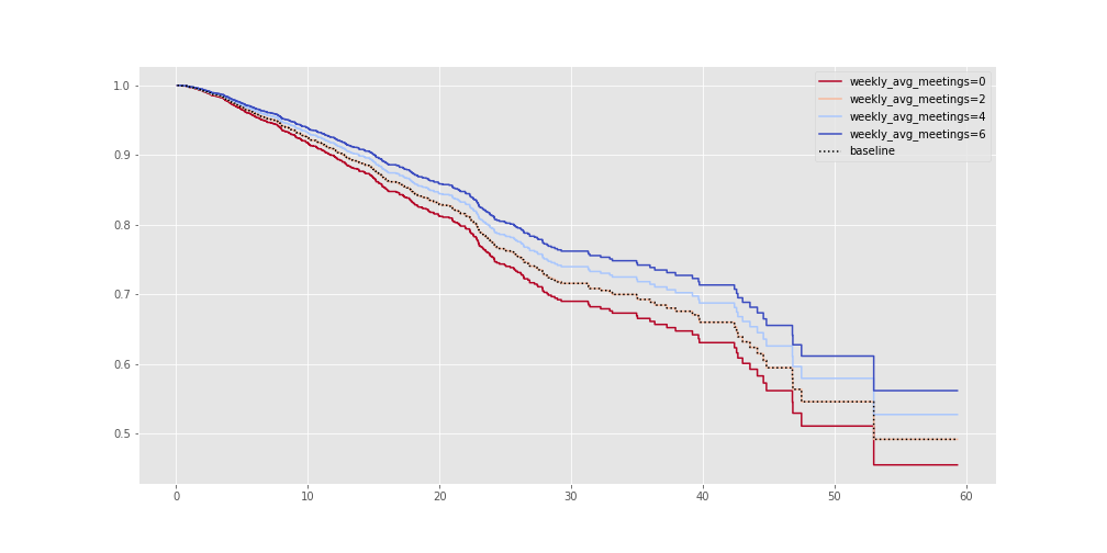 cph.plot_partial_effects_on_outcome('weekly_avg_meetings', np.arange(0, 8, 2), cmap='coolwarm_r');