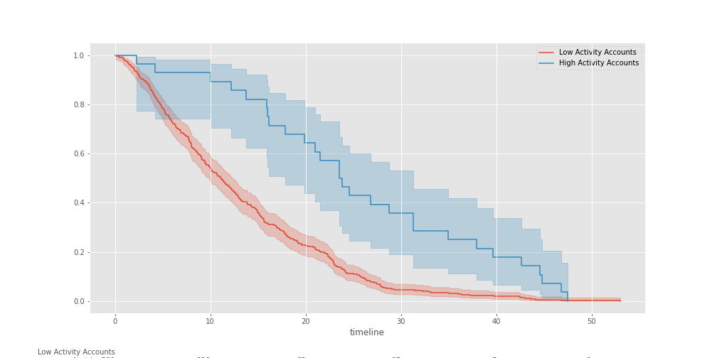 We can already observe that there’s a BIG difference in survivability between accounts with low activity and accounts with high activity. Let’s now get the lower and upper bounds for these types of accounts.