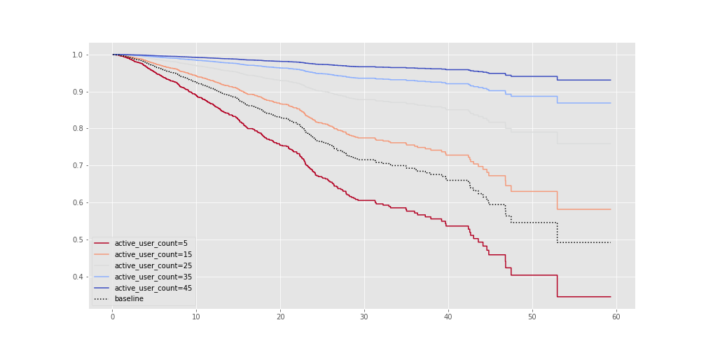 Once we fitted our model with our dataset we can see how our variables affect the churn probability for different groups. In the example bellow we can see how the survival probability changes for accounts with 5, 15, 25, 35, and 45 users.