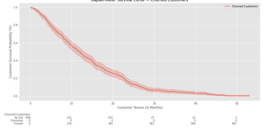 ax.set_title('Kaplan-Meier Survival Curve — Churned Customers')